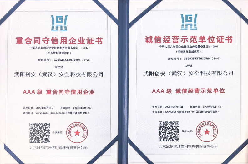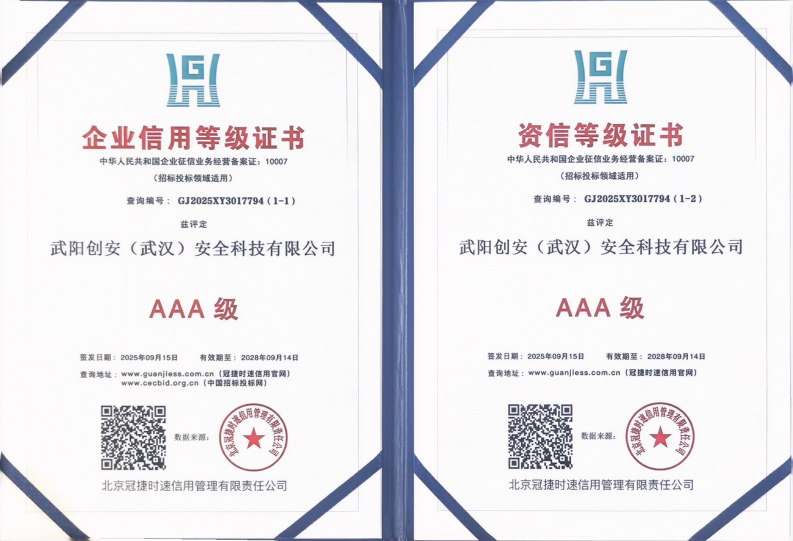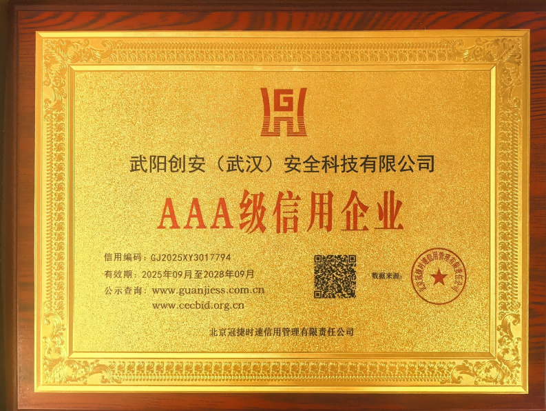 2025年9月15日,武阳创安(武汉)安全科技有限公司凭借规范的经营管理、良好的市场信誉与强劲的履约能力,顺利通过权威机构多维度严苛评审,正式斩获企业信用等级 3A 证书。这一认证是国内企业信用评价的最高等级,评审维度覆盖企业资质、经营状况、履约记录、发展潜力、社会责任等多个核心层面,其取得是对公司综合实力的高度认可,标志着武阳创安在信用建设、合规运营等方面跻身行业优质梯队。