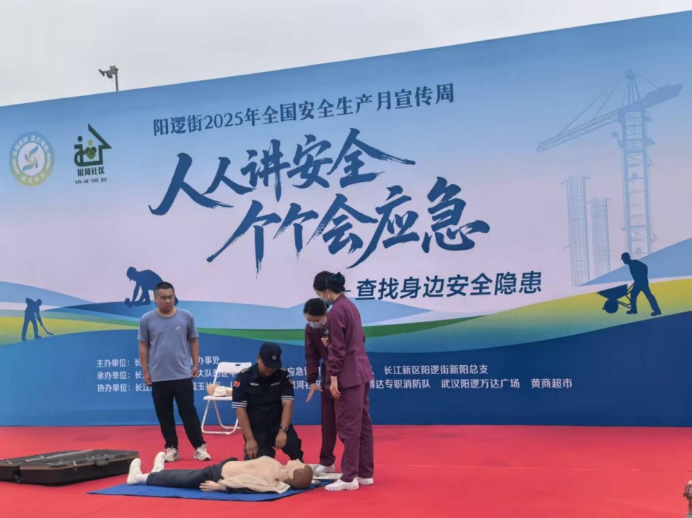 2025年6月24日上午,由长江新区阳逻街道组织,辖区内各职能部门、社区及万达广场各单位协作,全民参与的阳逻街2025年全国安全生产月宣传周在阳逻万达广场隆重举行。现场演示了消防灭火,心肺复苏,海姆立克急救法等多种应急处置方法,通过分发安全宣传资料,现场咨询答疑等方式,全面落实“人人讲安全,个个会应急-查找身边安全隐患”安全主题。